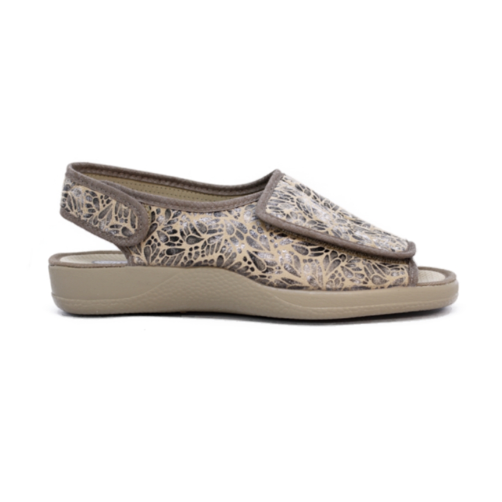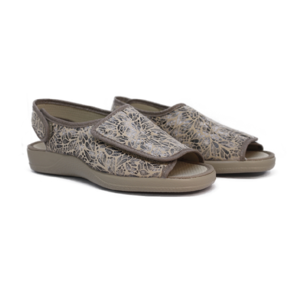 Zapatilla especial para pies delicados. Con su ancha tira adhesiva que ocupa todo el empeine, se consigue la adaptación a cualquier pie.  Realizado en tejido antibacteriano y transpirable. Suela de goma rugosa antideslizante.
