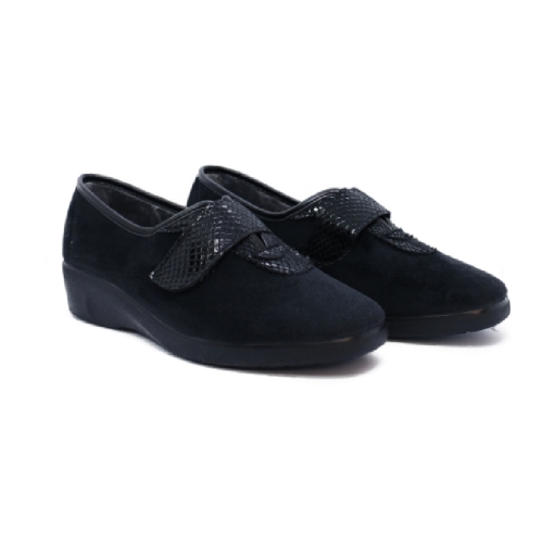 Elegante zapatilla de casa con cuña antideslizante de 4 cms, totalmente flexible. Realizada en suave y abrigado tejido aterrciopelado. Cierre con velcro para facilitar el calce