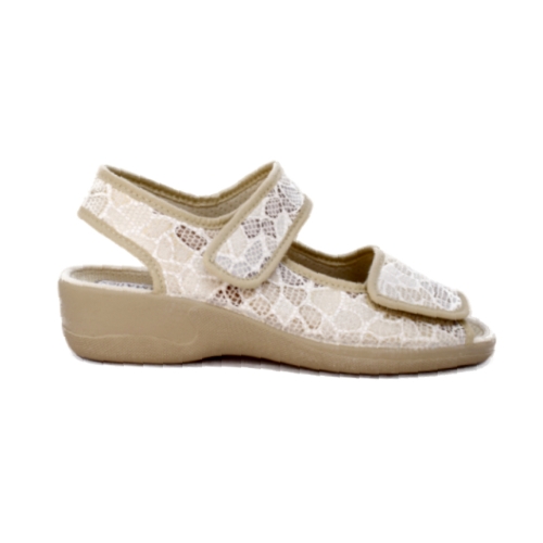 Zapatillas de casa con talón y puntera abiertos y cuña de 4.5cm. Tiene dos cierres adhesivos, uno el tobillo y otro en el empeine ideal para pies anchos. Forro interior en textil y suela caucho natural (latex). Chinela Ideal para mantener tus pies frescos en verano. Suela  con grabado especial rugoso para evitar posibles deslizamientos. Fabricada con tejidos en microfibras y algodón que permiten una constante ventilación.