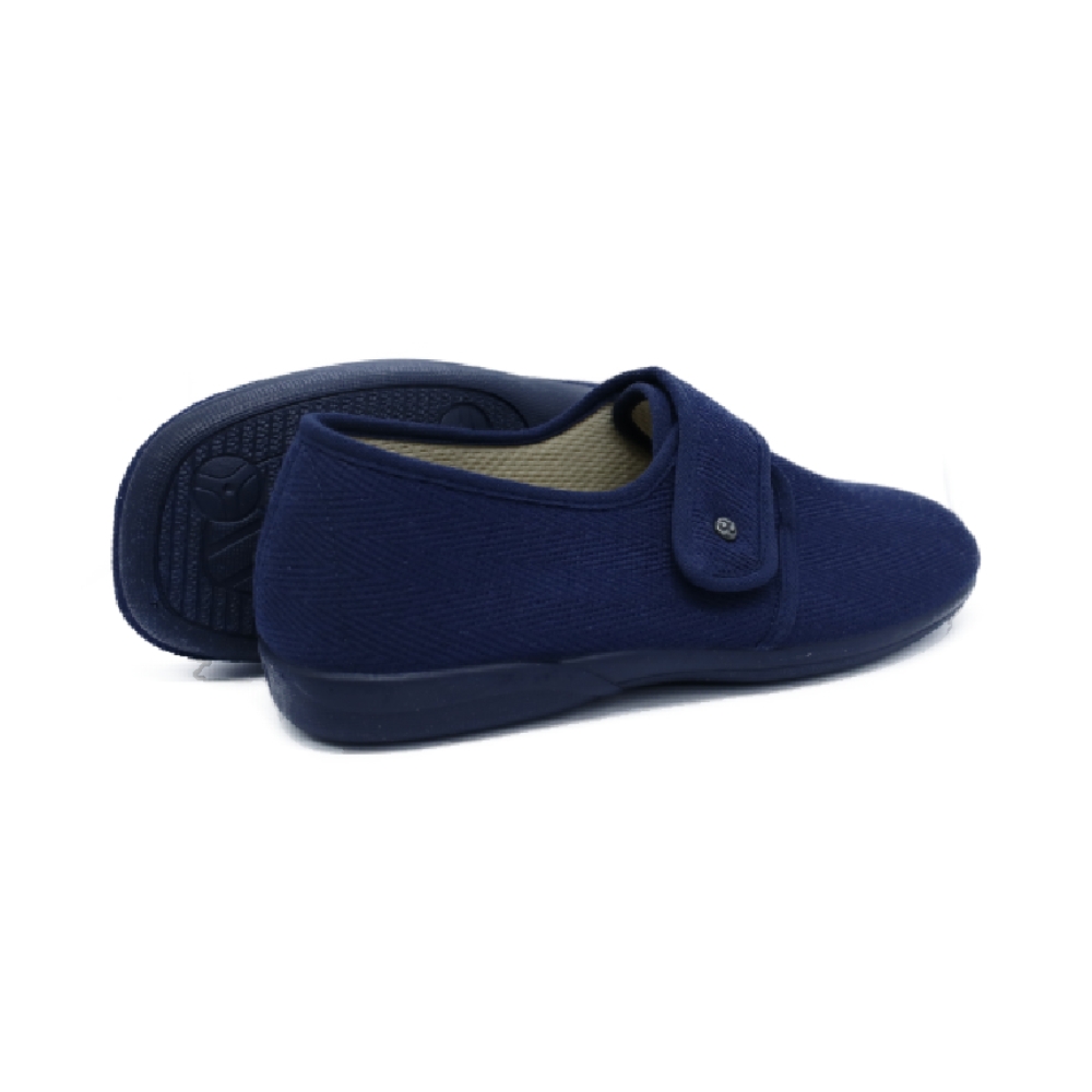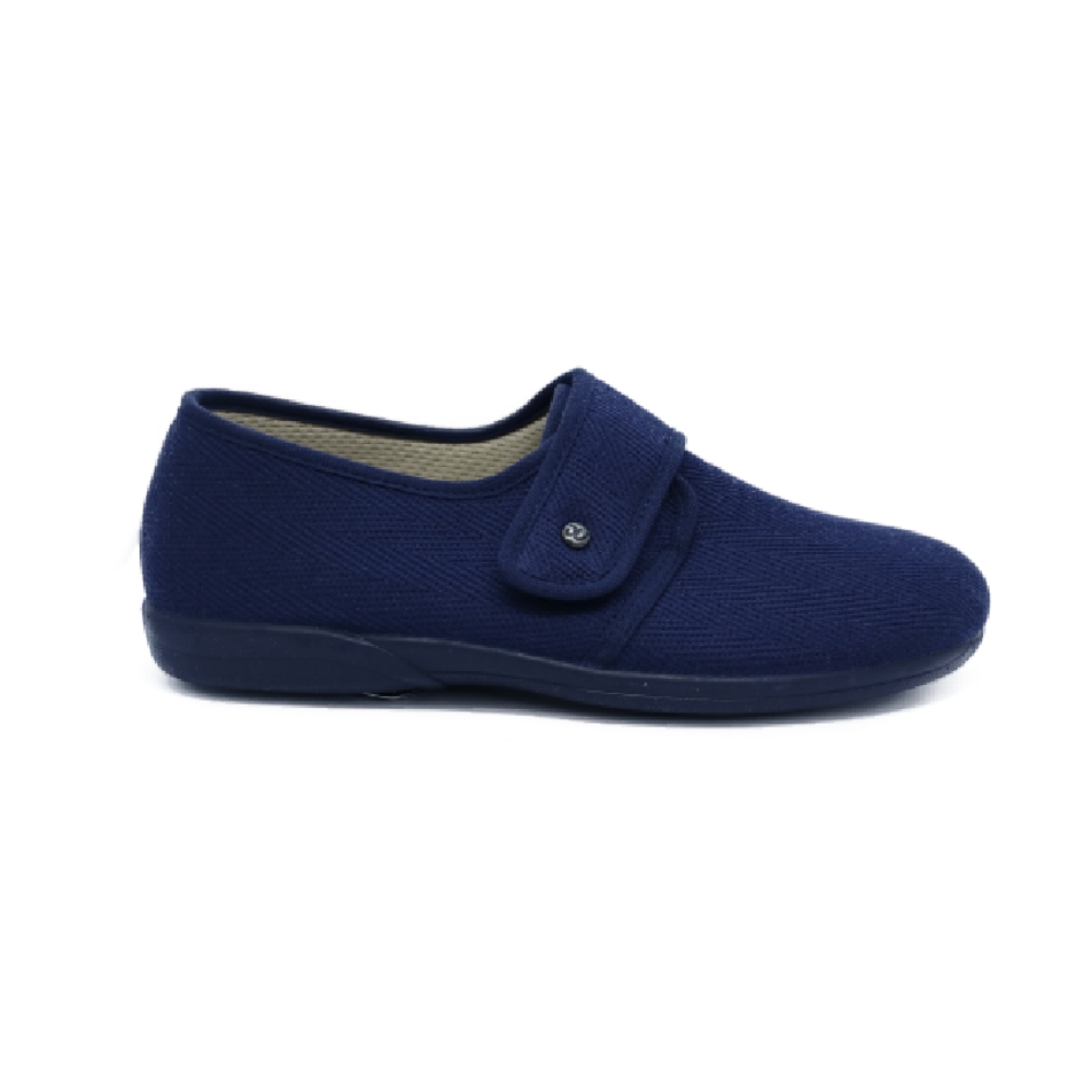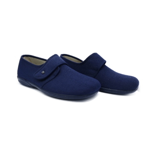 Zapatilla de Tira adhesiva en textil marino  dibujo espigas. Tejido antibacteriano y transpirable. Suela de caucho antideslizante. Ancho especial. Una zapatilla con aspecto de zapato