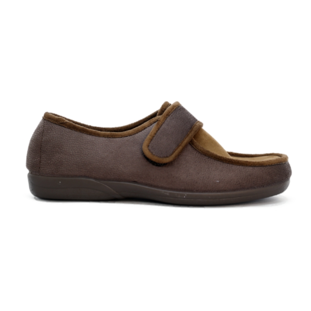 Tejido Afelpado de Tacto Suave: El corte exterior está confeccionado en un tejido con textura afelpada en tonos marrones, que proporciona una calidez inmediata y una sensación muy agradable al contacto con el pie.