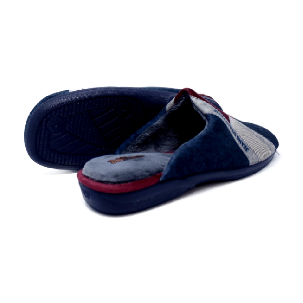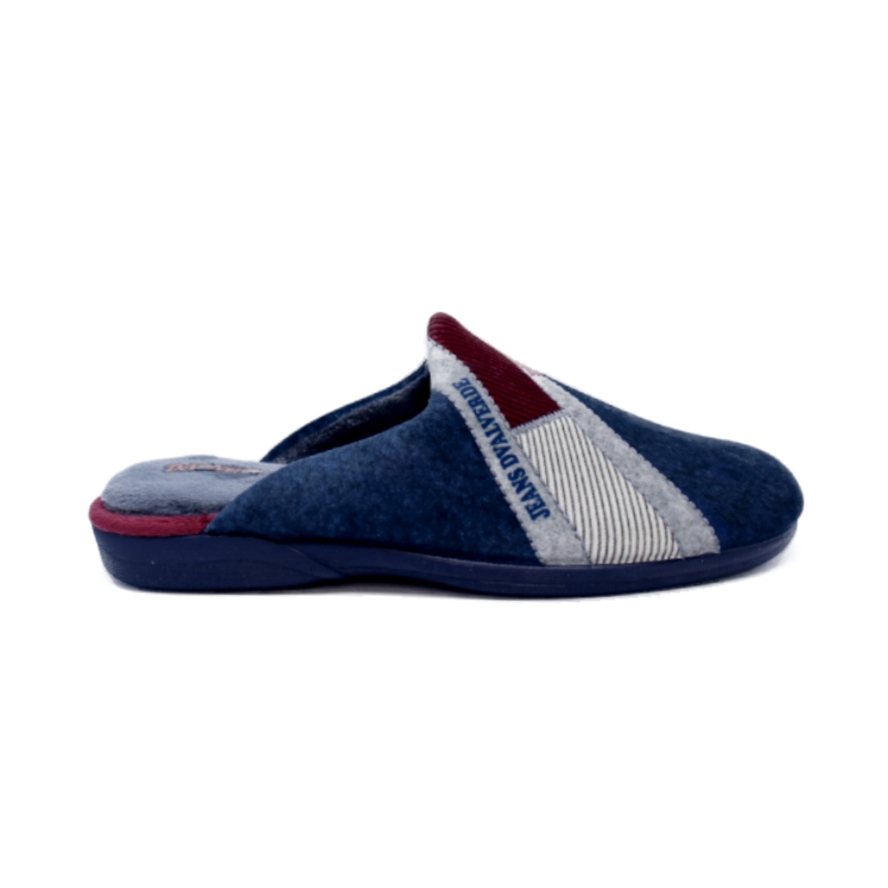 Zapatilla azul marino de estilo clásico y diseño cerrado, con detalles en gris y burdeos y una inscripción "JEANS DEVALVERDE" en el lateral. Fabricada con materiales suaves para mayor comodidad en el hogar, cuenta con una suela antideslizante que ofrece estabilidad al caminar. Ideal para quienes buscan comodidad y estilo en una pantufla de uso diario.