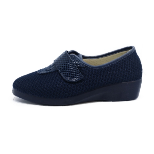 Zapatilla cerrada cómoda. Cierre de Tira adhesiva. Piso de caucho natural y antideslizantes. Plantilla de espuma látex transpirable. Tejidos transpirables. Plantilla antibacterias. Disponible en color azul . Su cuña mide 4 cm. Hecho en España.