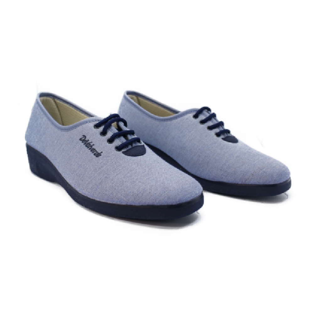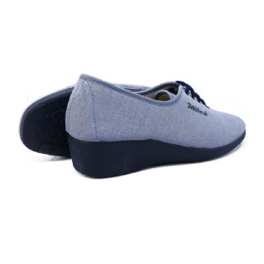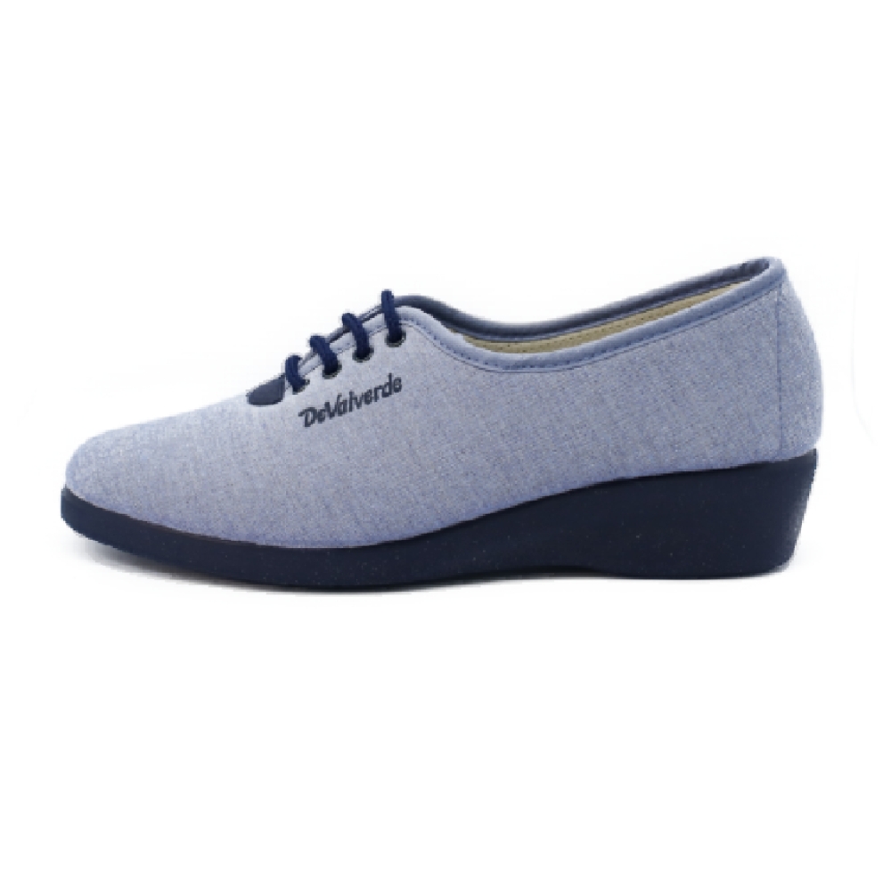 Zapatilla de cuña para mujer realizada en tejido color azul con tratamiento antibacteriano. Ajuste mediante cordones. Cuña de goma antideslizante de 3 cm.