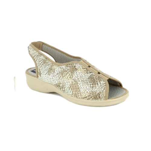 Sandalia de verano de calle para mujer, fresca y muy cómoda, playera estilo sandalia puntera y talonera abiertas, corte fantasia, en color beige. Adornos: ribete de tela con pespuntes al tono, tres prácticos elásticos en la pala y otro en la talonera, que permiten una fácil colocación y un perfecto ajuste para el calce de los pies más delicados. Forro y plantilla acolchados, (ambos en rejilla beige). Piso de caucho natural negro flexible y antideslizante que contribuye a que sea un artículo más estable y tenga una gran adherencia, con pequeña cuña de 3,5 cm en la parte del talón, de última generación que aporta gran elasticidad al zapato y proporciona mayor sensación de confort y comodidad al andar. Fabricada en España.