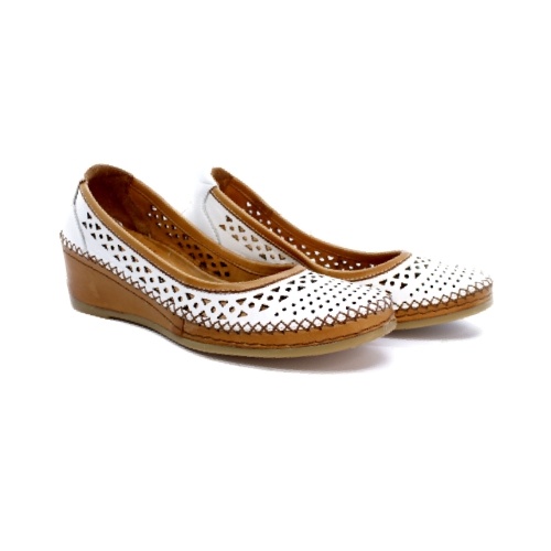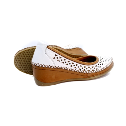 Salón ancho de mujer realizado en dos tonos de piel. Cosido a mano y con un bonito diseño de piel troquelada. Interior y planta acolchada de piel. Cuña de 6 cm. Suela de caucho antideslizante