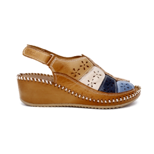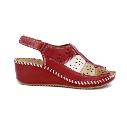 Sandalia troquelada de mujer, con cierre adherente. Modelo cómodo, fabricado en piel natural, con suela de goma ligera y flexible. Planta acolchada. Color granate-multicolor. Altura cuña 5 cm. Diseño y confort para andar sin limites.