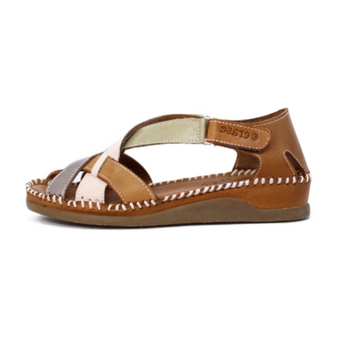 Piel de Primera Calidad: Confeccionada en piel natural de tono cuero con tiras cruzadas en gris, beige y metalizado que se adaptan suavemente al pie.