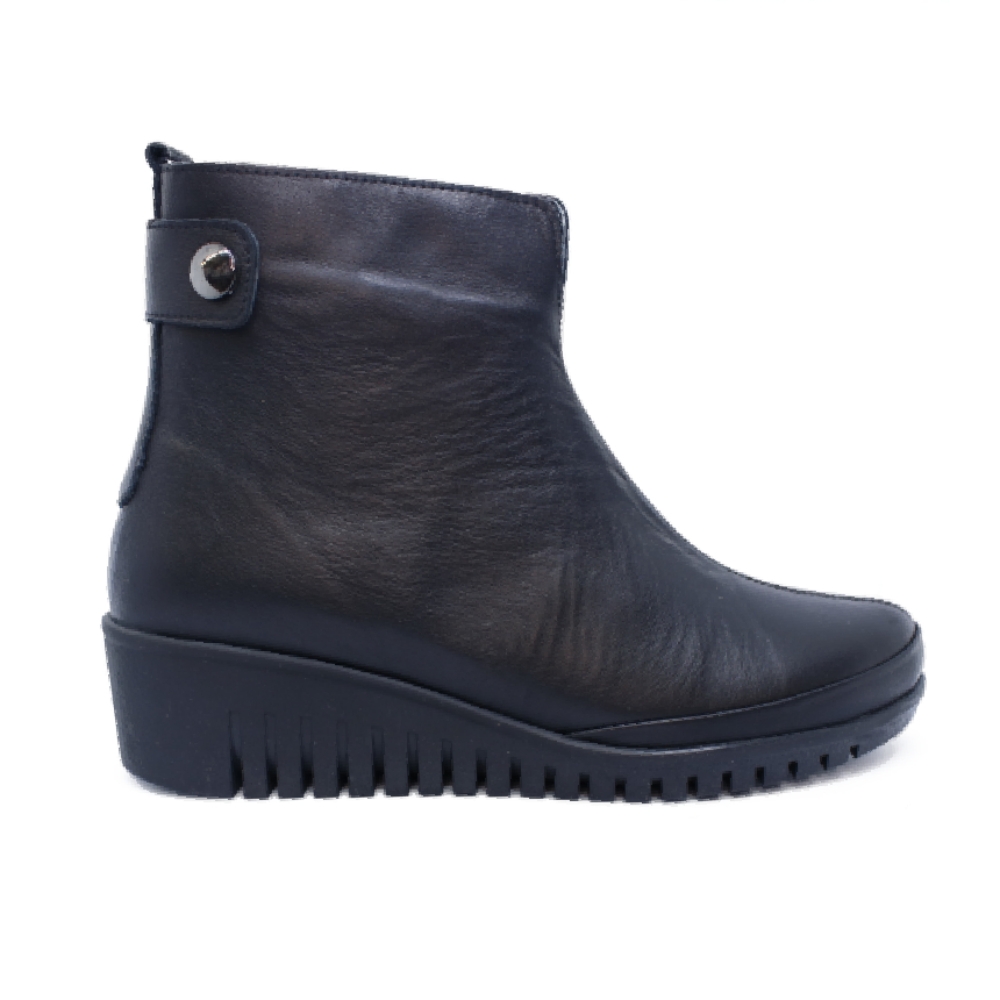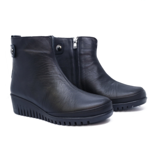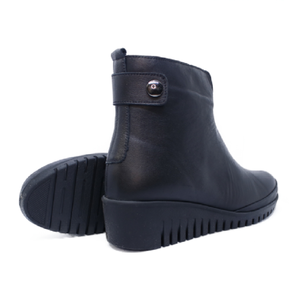 Botines elaborados en suave piel tintada en color negro. Cierre de cremallera en la parte interna. Diseño con la pala completamente lisa. La caña tiene una altura de 13cm aprox.  Plantilla acolchada extraíble. Suela de goma flexible con un grosor de 1cm aprox. y una pequeña cuña de 4 cm aprox. que aportan comodidad a estos botines.