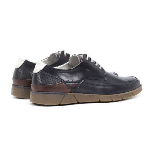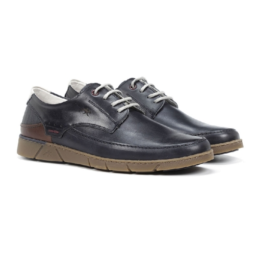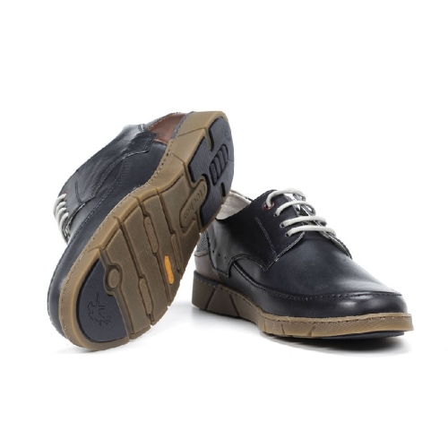 Zapato elaborado en suave piel tintada en color azul. Parte trasera con apliques de piel grabada, piel color marrón y una pequeña pieza de piel en color taupe en el contrafuerte. Cierre de cordones. Forro y plantilla elaborados en piel. Plantilla acolchada y extraíble. Suela de goma cosida. Hecho en España.