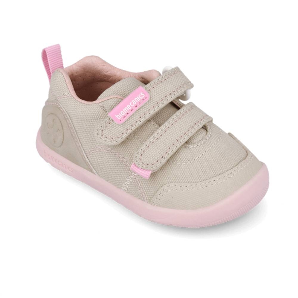 Zapatillas de lona BAREFOOT Biomecanics para primeros pasos de niña, fabricadas en textil suave y resistente de color beige combinado con detalles en rosa.