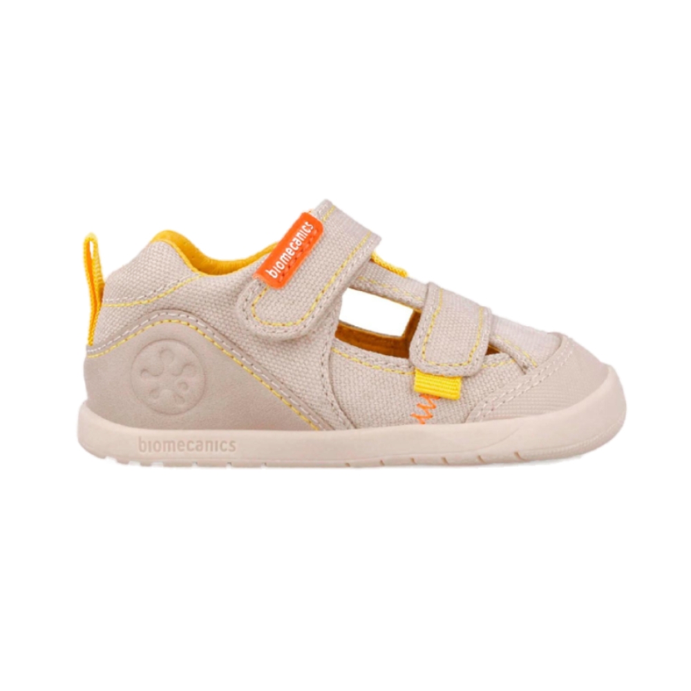 Las sandalias de primeros pasos Biomecanics en color beige combinan un diseño pensado para el crecimiento del pie con detalles prácticos para el día a día. Su acabado mate y la puntera redonda ofrecen una silueta suave y protectora, mientras que el cierre de tiras ajustables facilita el calce y la sujeción en cada movimiento.