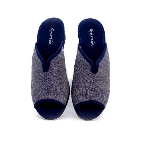 Zapatilla de casa de la marca Garzon para mujer en color azul. Zapatilla tipo cuña, con apertura  en el centro para empeines altos, cómodas y con suela de goma resistente.