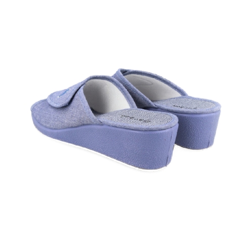 Cómoda chinela con cuña de 4 cms. Gracias a su cierre de Tira adhesiva se ajusta a cualquier pie. Suela de caucho antideslizante. Plantilla textil acolchada.