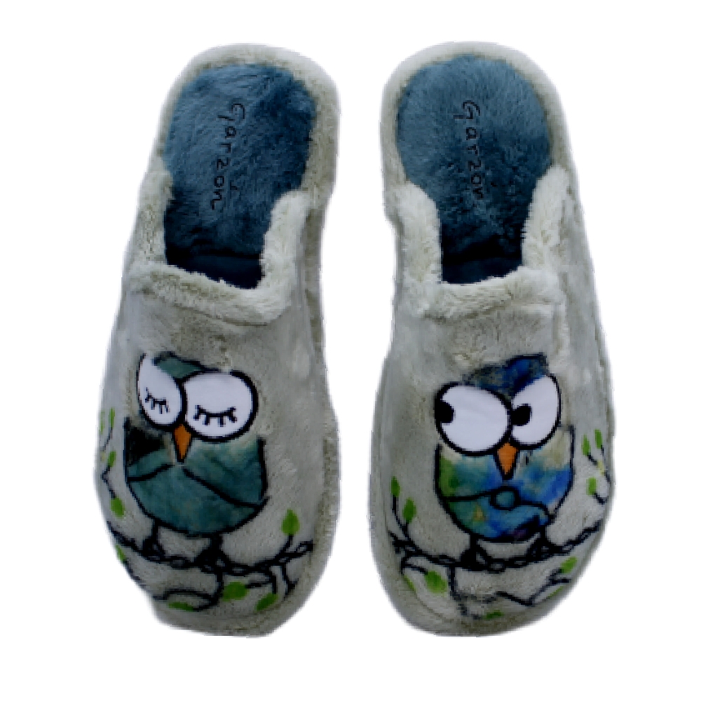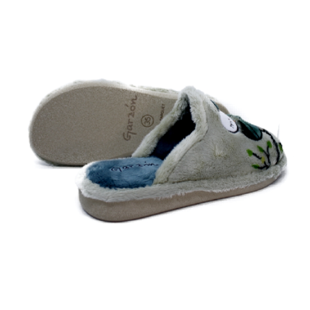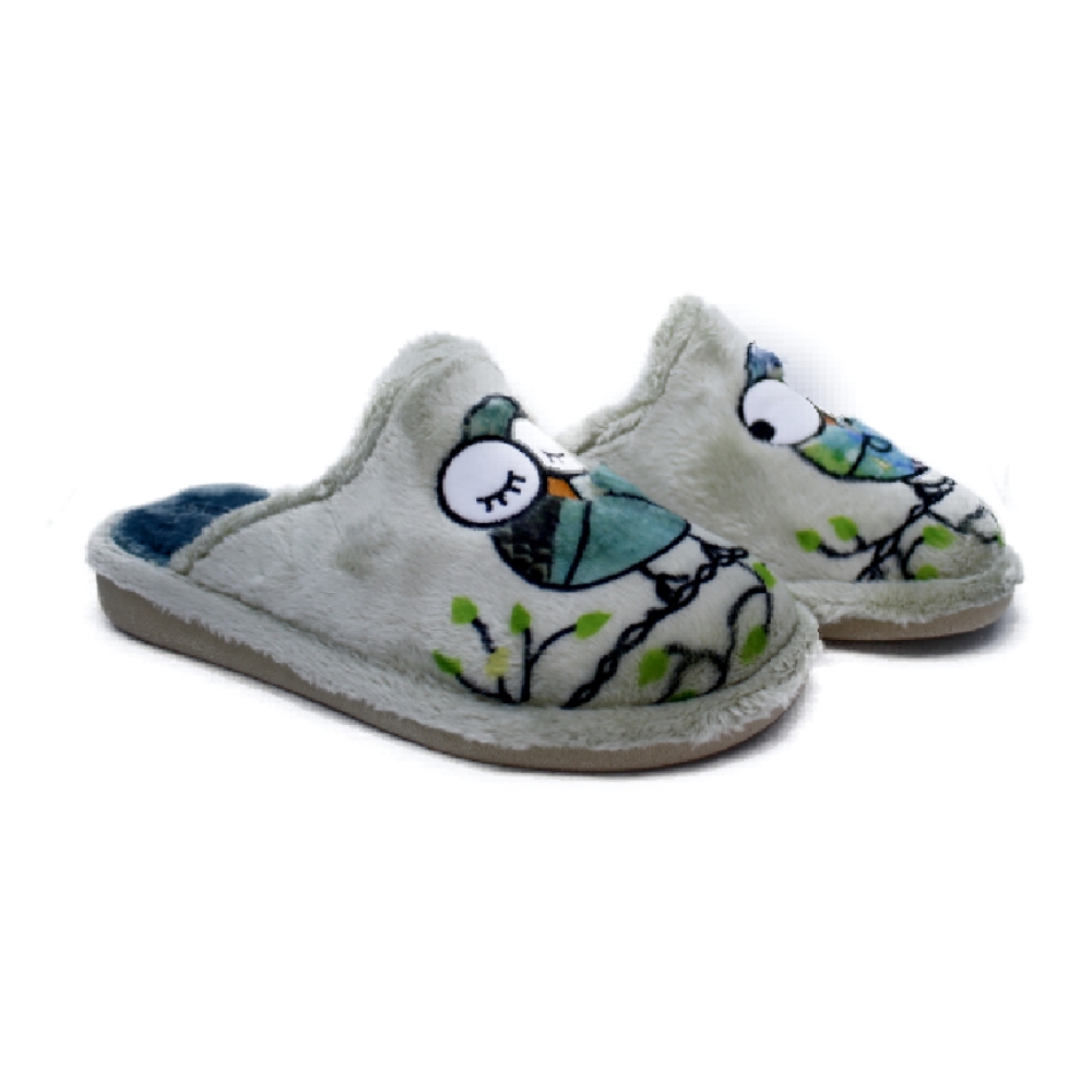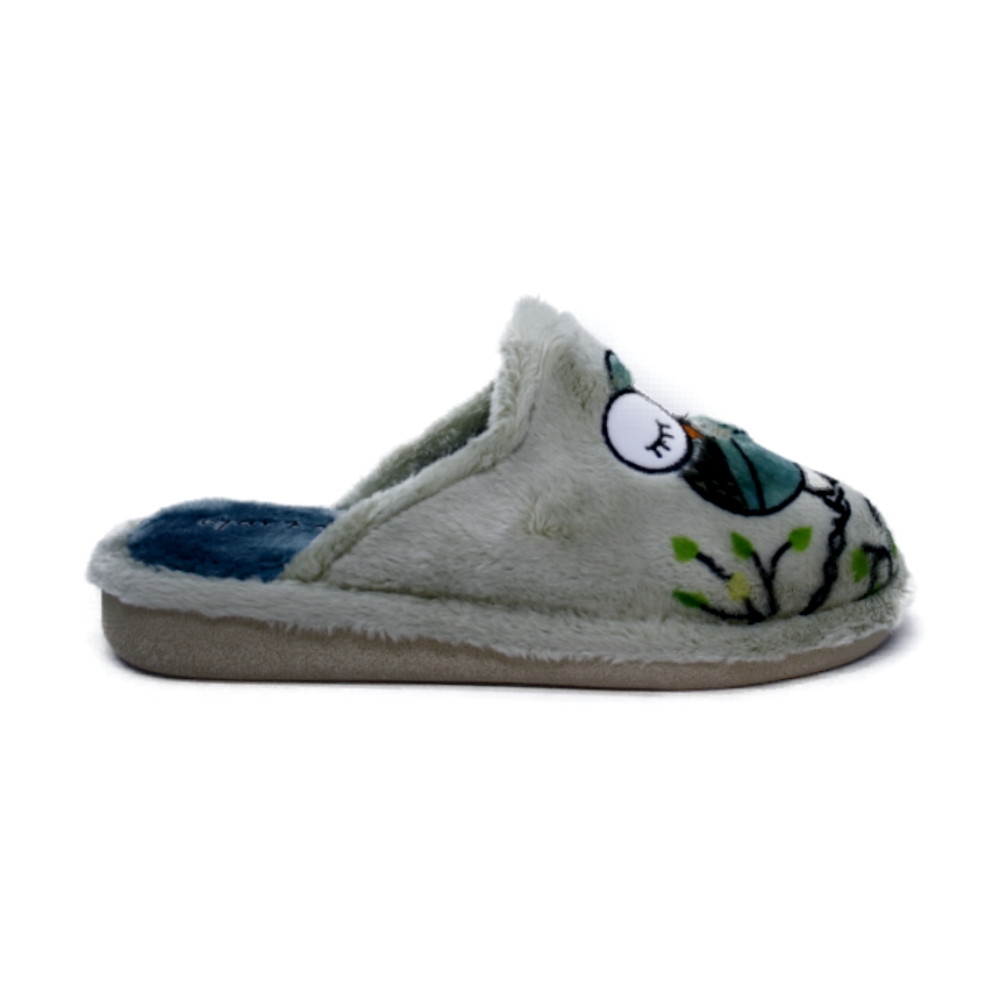 Zapatillas de casa para mujer en color musgo oliva con bordado de búhos. Suaves y cálidas, con forro mullido para máximo confort. Diseño tipo chinela para calce fácil y suela microporosa especial para parquet, ligera y silenciosa. Fabricadas con materiales de calidad, combinan comodidad, resistencia y estilo para uso diario todo el año.