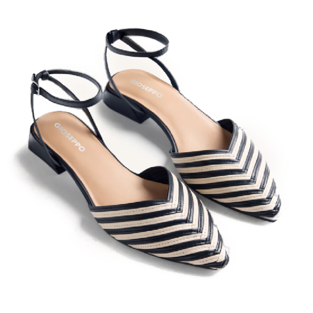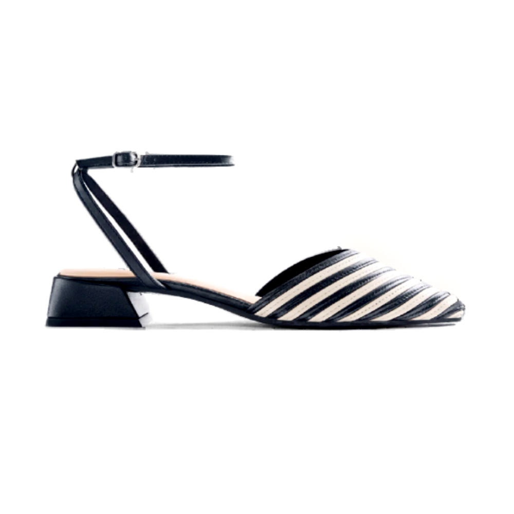 Zapatos de tacón estilo salones destalonados de piel bicolor. Punta afilada. Tacón tipo bloque en forma de trapecio. Cuentan con planta acolchada y cierres ajustables tipo pulsera. Altura tacón: 3 cm.