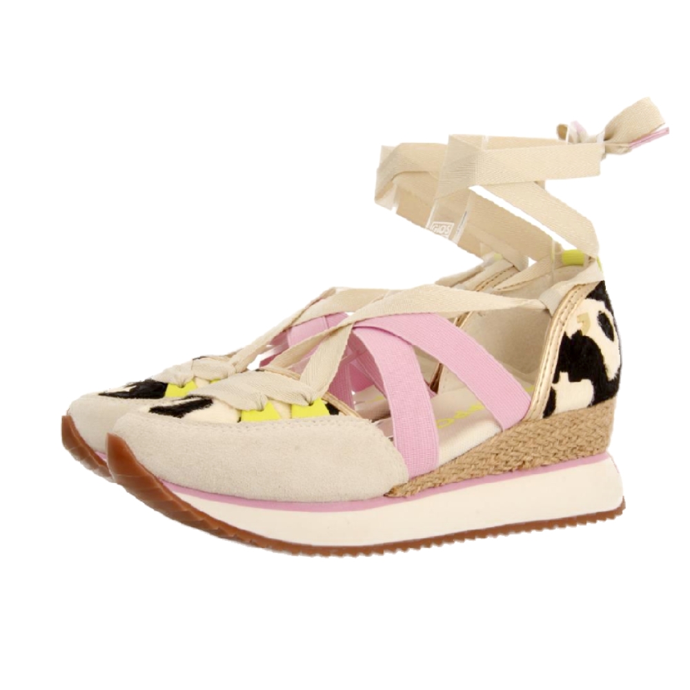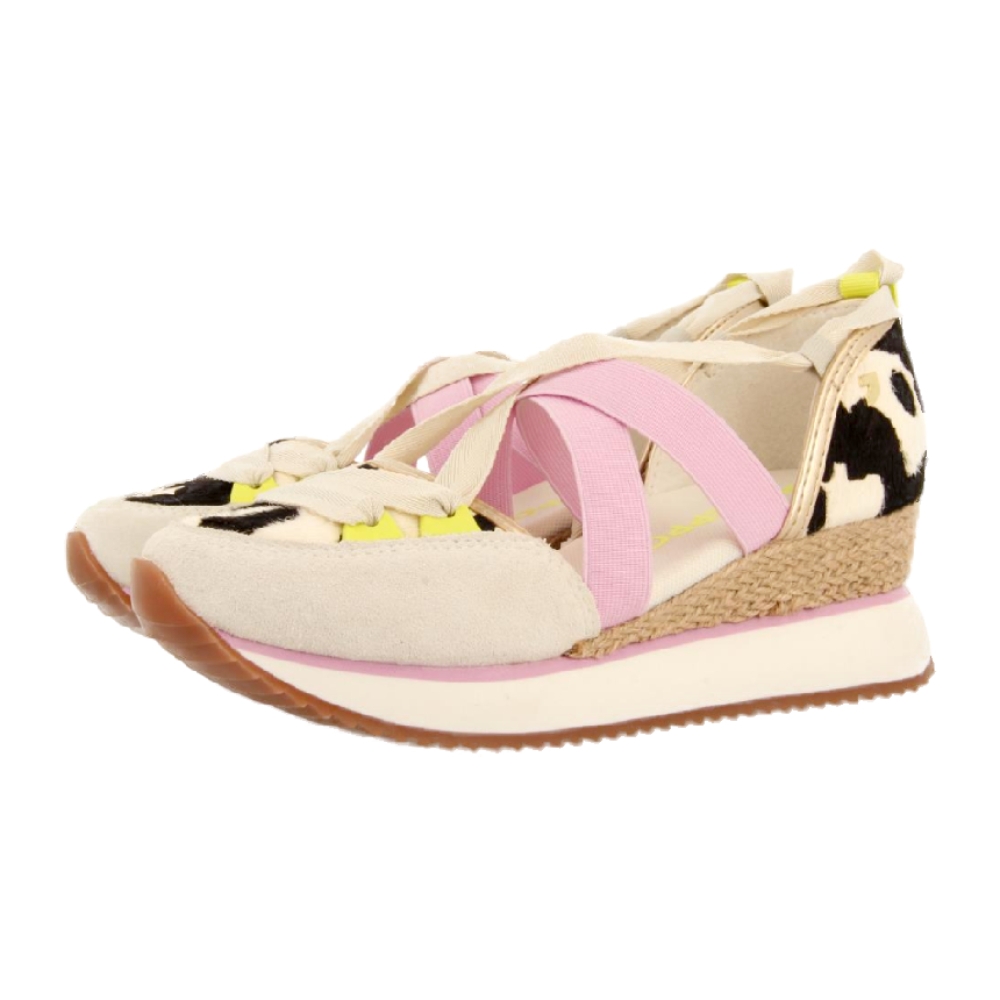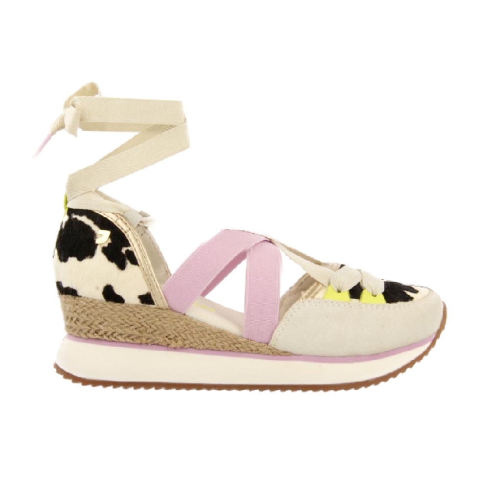 Las sandalias Ludlow anuncian la llegada del buen tiempo con su diseño fresco y divertido. Con una cuña de ráfia y una combinación audaz de piel estampada de vaca con detalles en verde flúor y lila, son el equilibrio perfecto entre originalidad y confort.