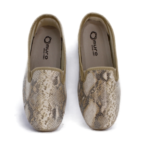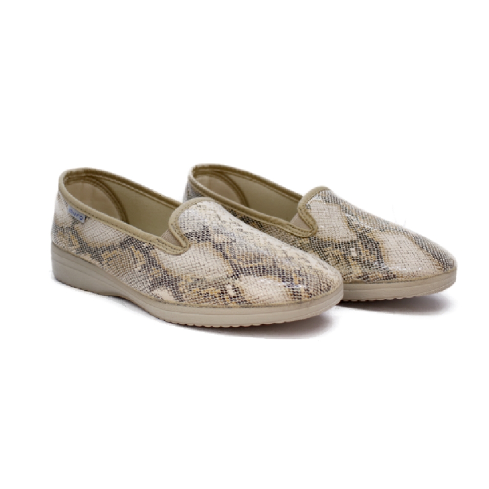 Zapatilla de tejido con aspecto de mocasín con estampado de serpiente en color beige de la marca Garrido Muro. Lavables en lavadora, muy transpirables. Suela de caucho antideslizante muy flexible. Plantilla extraíble. Fabricada en España.