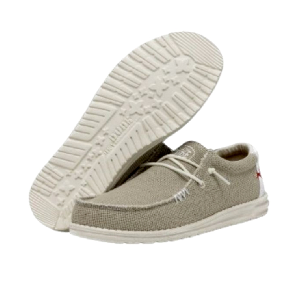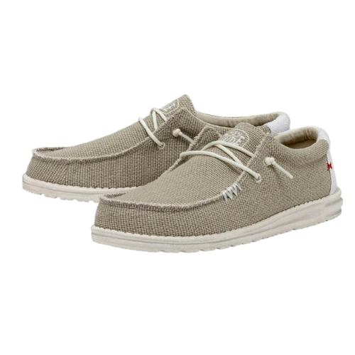 Mocasín Wally Braided HD40003 de la marca Hey Dude en color beige. Corte realizado en algodón orgánico, forro interior de algodón orgánico muy transpirable con plantilla de espuma viscoelástica con un 15% de corcho reciclado que absorben la humedad y son ergonómicas, cierre Easy On con cordones y suela Eva Ultraligera.