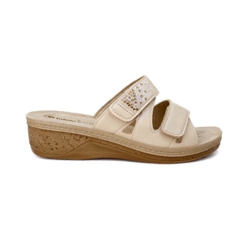 Sandalia en cuña con cierre en 2 tiras velcro. Línea super cómoda. Fabricado en polipiel muy suave detalle brillantes. Color arena reflejos dorados. Planta de PIEL super acolchada y efecto absorbente.   Suela de P.U. extra ligera con una cuña de unos 4,5 cm de altura max. aprox. y 2 cm grosor aprox. en la delantera.