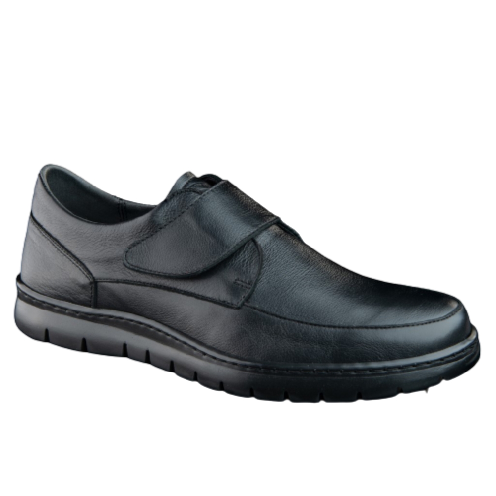 Zapato con cierre de velcro fabricado en Arnedo (La Rioja) en un ancho confortable de piel. La suela de goma es ligera y aislante. Un zapato todo terreno ideal para llevar muchas horas.