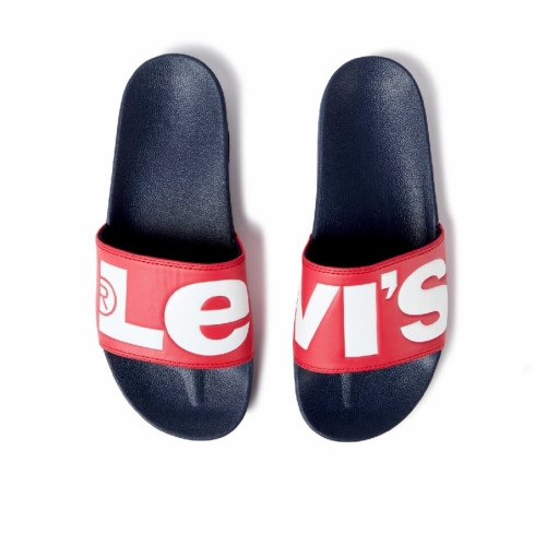 Chancla pala  azul y pala rojo  con logo de la marca en blanco, con carácter. Llévalos con sudaderas, vaqueros o pantalones cortos, en la playa, en una salida de BBQ o para ir a la aventura. Verás el género: son tus sandalias de corazón del verano, con el logotipo de Batwing Levi's.
