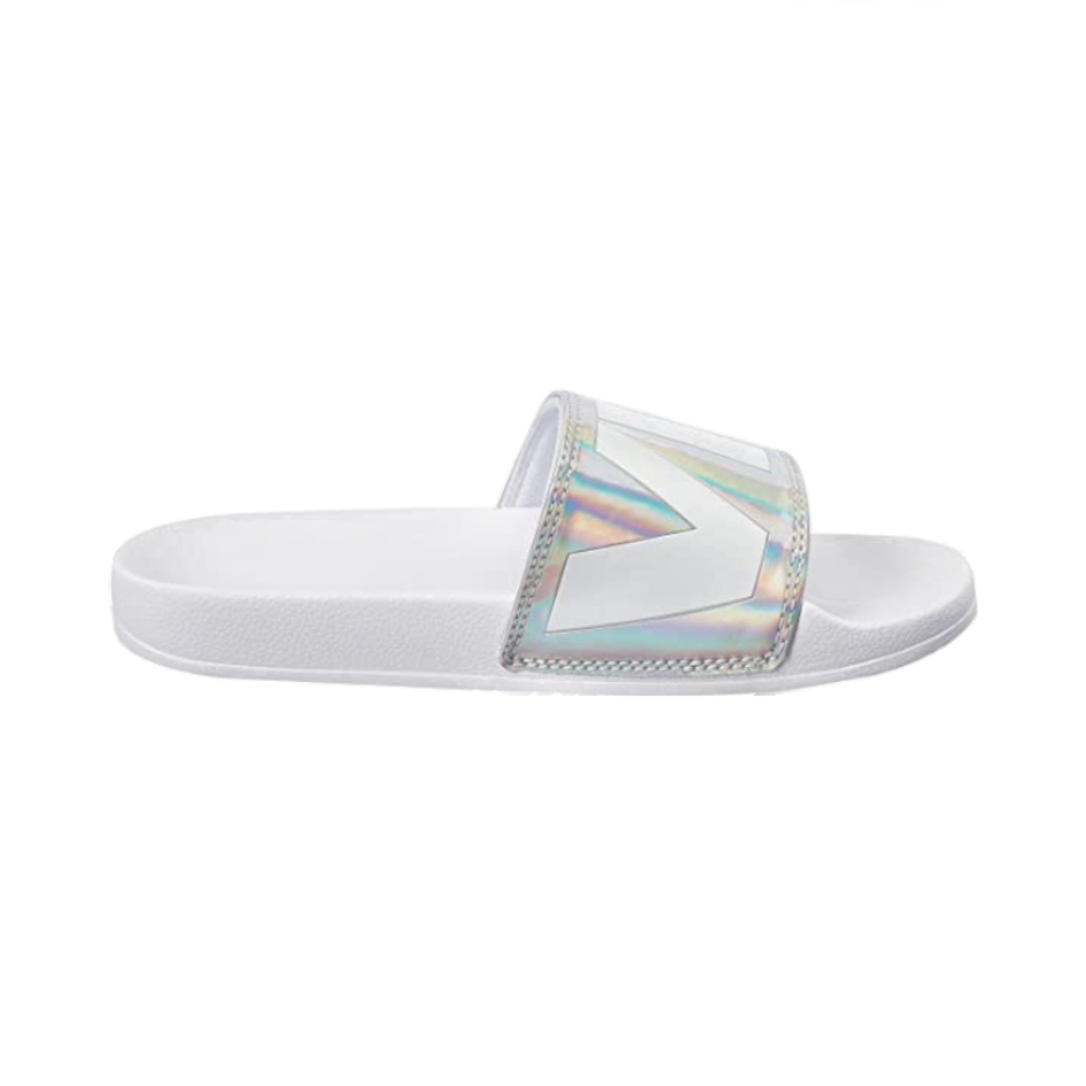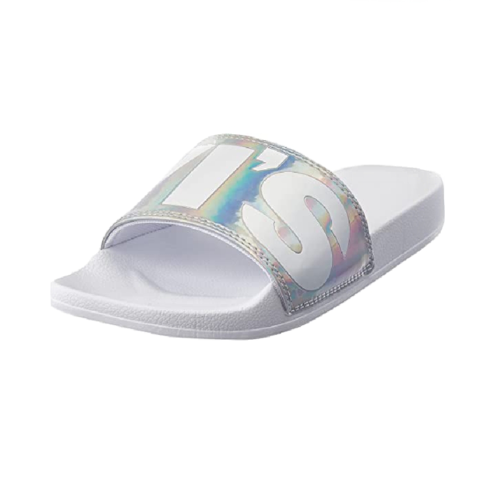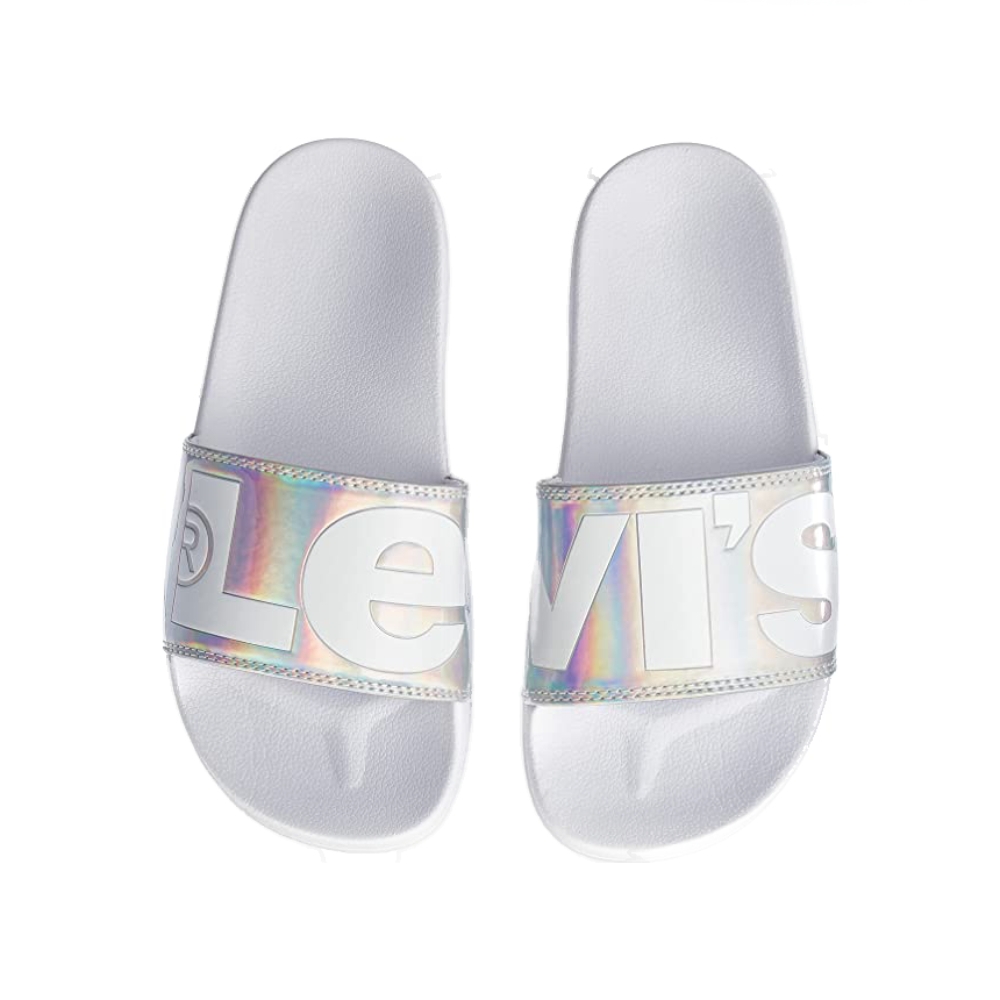 Chancla pala  plata con logo de la marca en blanco , con carácter. Llévalos con sudaderas, vaqueros o pantalones cortos, en la playa, en una salida de BBQ o para ir a la aventura. Verás el género: son tus sandalias de corazón del verano, con el logotipo de Batwing Levi's.