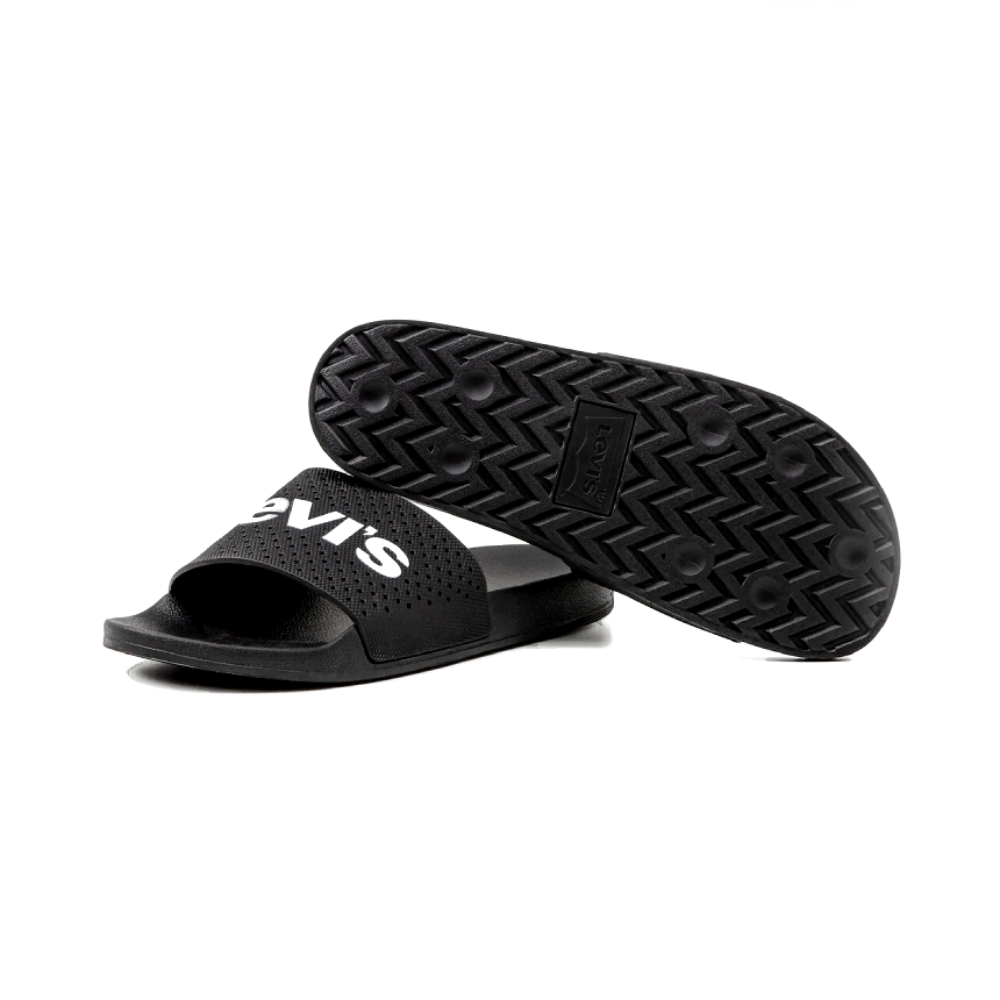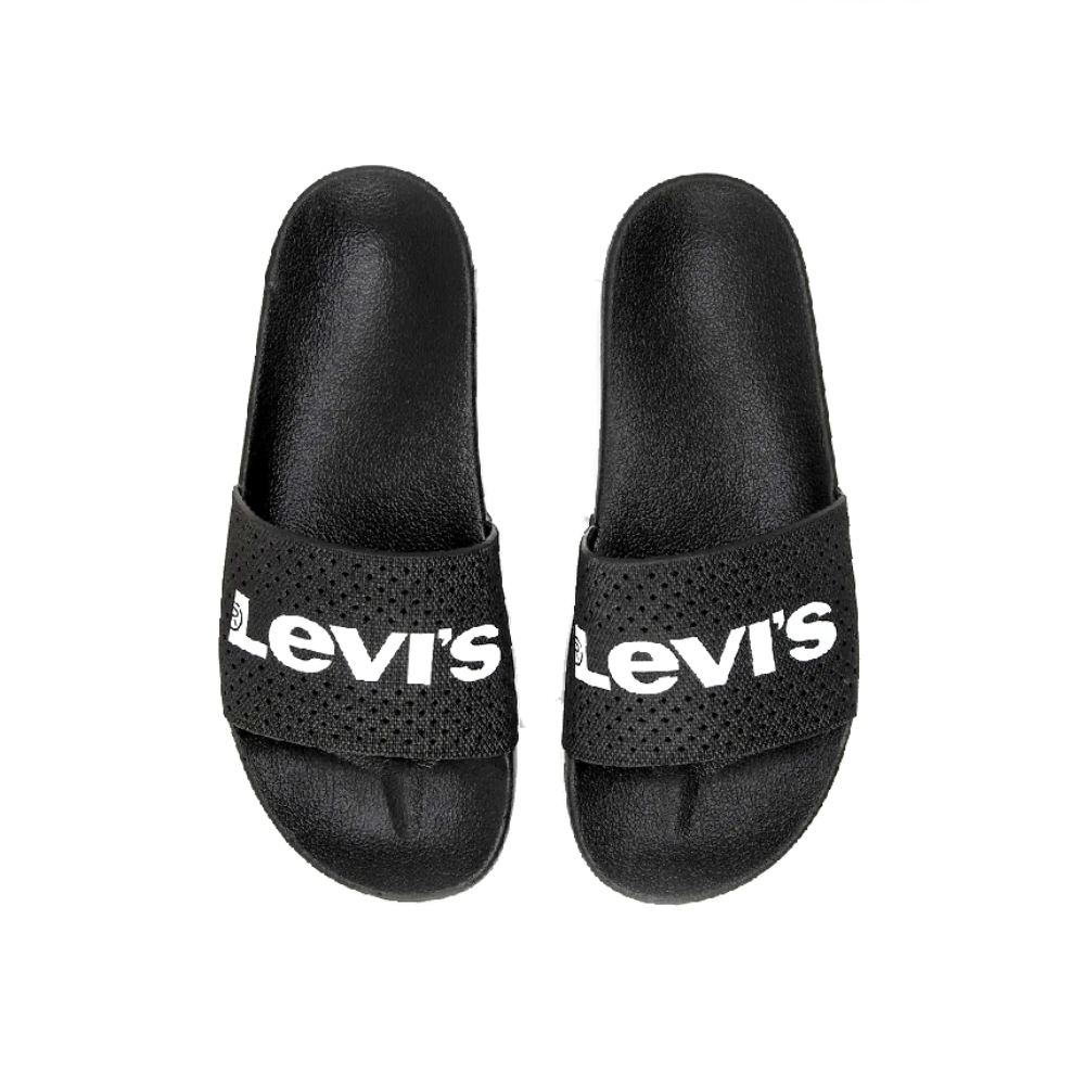 Chancla pala  negra con logo de la marca en blanco, con carácter. Llévalos con sudaderas, vaqueros o pantalones cortos, en la playa, en una salida de BBQ o para ir a la aventura. Verás el género: son tus sandalias de corazón del verano, con el logotipo de Batwing Levi's.