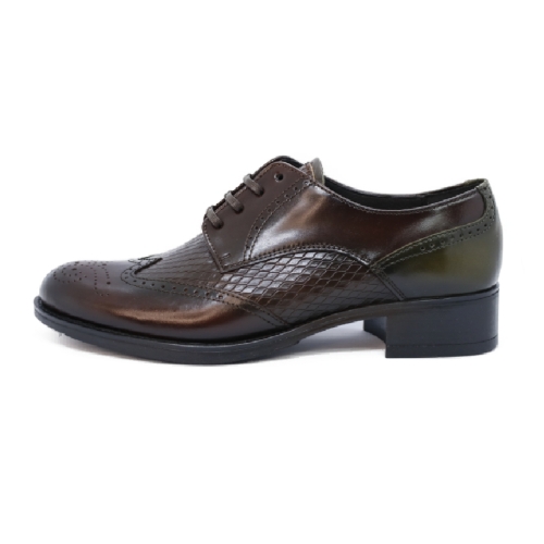 Blucher de mujer realizado en piel de primera calidad. En tonos marrones y verdes con detalles efecto serpiente. Corte pala vega con picados en su parte delantera. Interior totalmente forrado en piel incluido la suela. Cosido y pegado a mano.