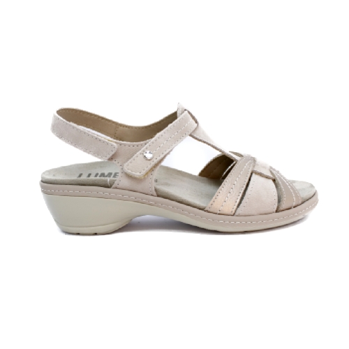 Sandalia de mujer realizada en piel y serraje beige con con cruce central que simula un nudo. Gracias a su doble Tira adhesiva, sujeta perfectamente el pie. Incorpora plantilla extraíble que pemirte la adaptación de cualquier plantilla ortopédica. Suela de caucho en dos tonos con una altura de 4 cm.