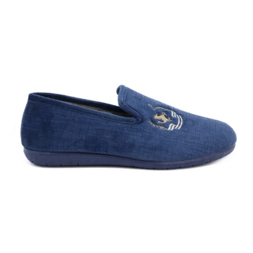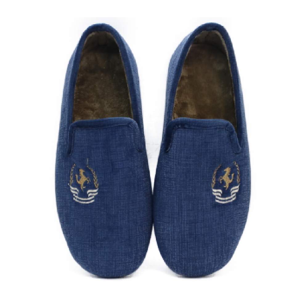 Zapatilla de casa para hombre realizada en suave tejido bamara. Suela de caucho antideslizante. Detalle de escudo bordado.