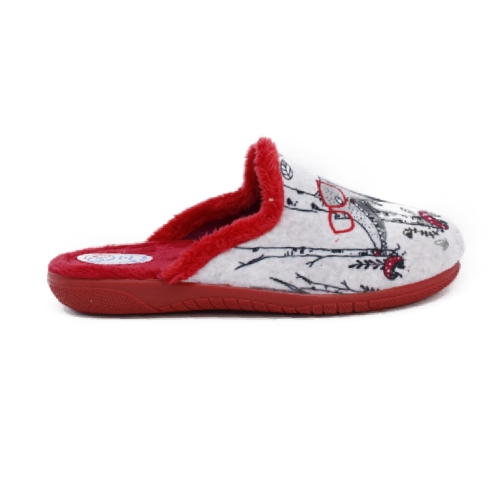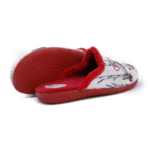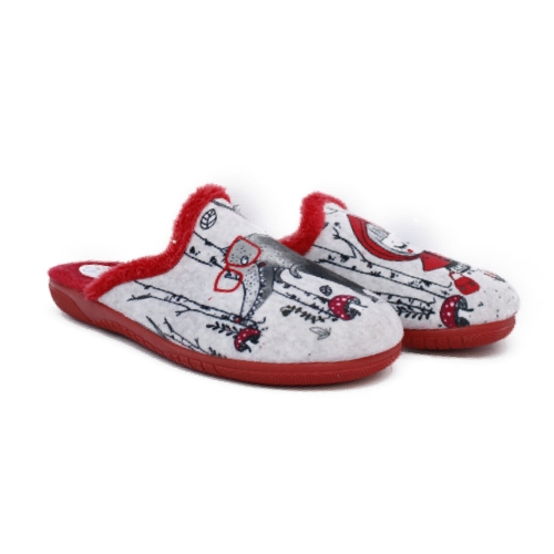 Zapatilla destalonada para niñas. Viene fabricada en bamara suave y calentito con dibujos de Caperucita y el lobo.. Suela de caucho antideslizante y totalmente flexible. Apto para lavadora.