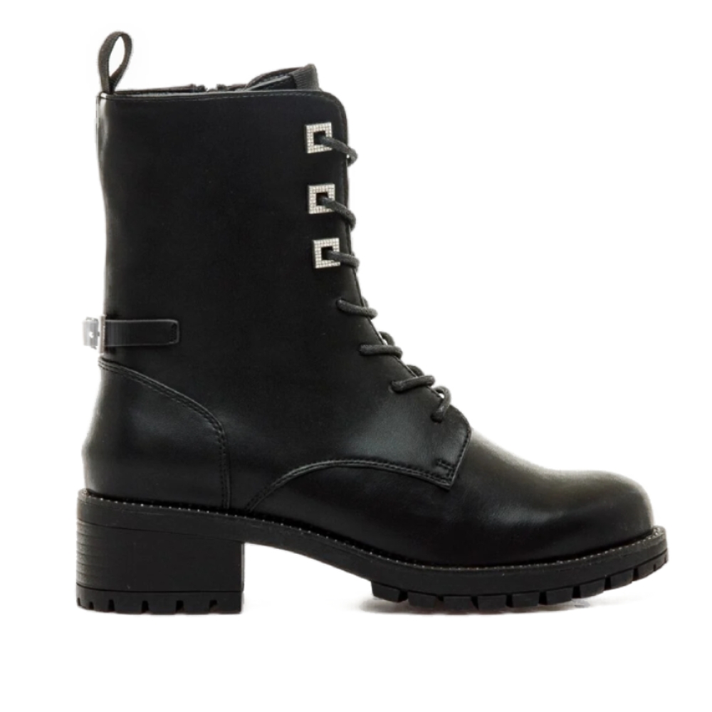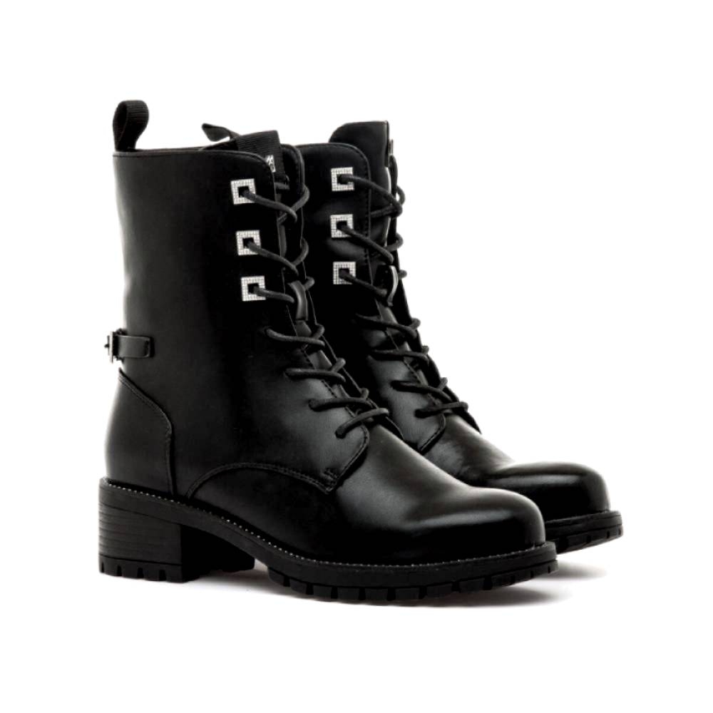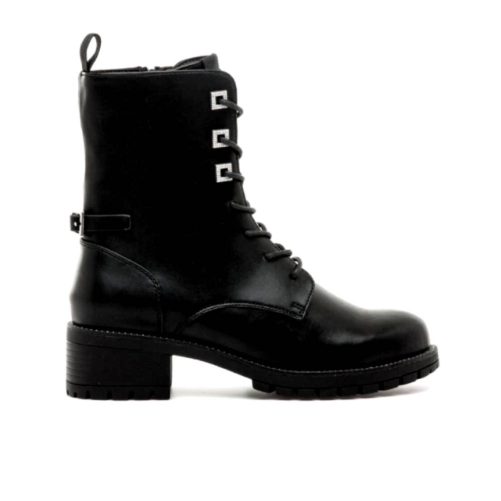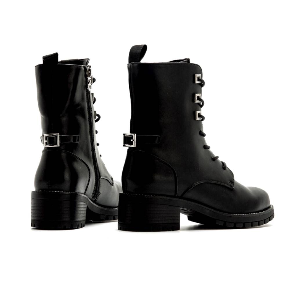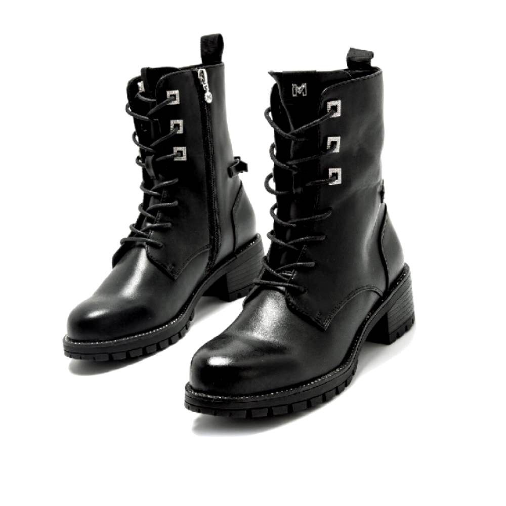 Botines negros para mujer, modelo Altea de Mariamare de estilo militar. Este diseño combina una estética robusta con detalles modernos, como los ojales metálicos y un cierre de cordones que asegura un ajuste perfecto. La suela gruesa con relieve aporta tracción y comodidad, mientras que el tacón bajo y ancho brinda estabilidad para el uso diario. El detalle de hebilla en el talón añade un toque distintivo. Perfectos para looks urbanos con un aire desenfadado.