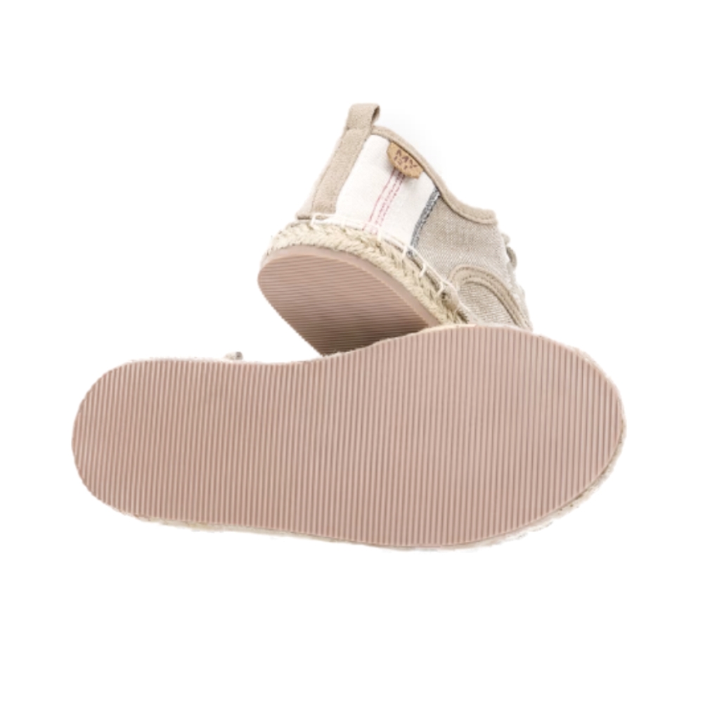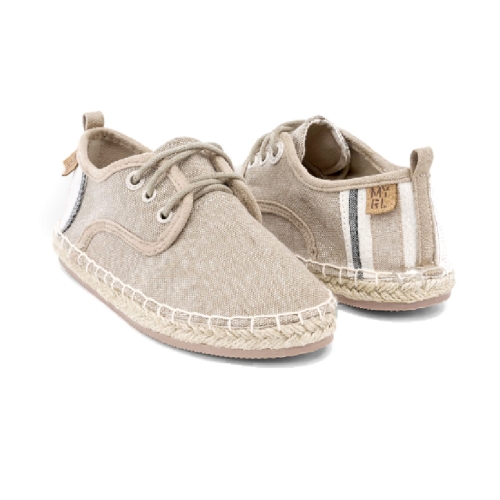 Zapatilla cordones niño con adorno de cañamo o yute alrededor de la suela. Suela de goma flexible y resistente. Realizado en lino color beig y con forro interior textil y plantilla acolchada. Un calzado ideal para todo tipo de eventos y ceremonias además de ser fresquito y cómodo para usar el resto del verano.