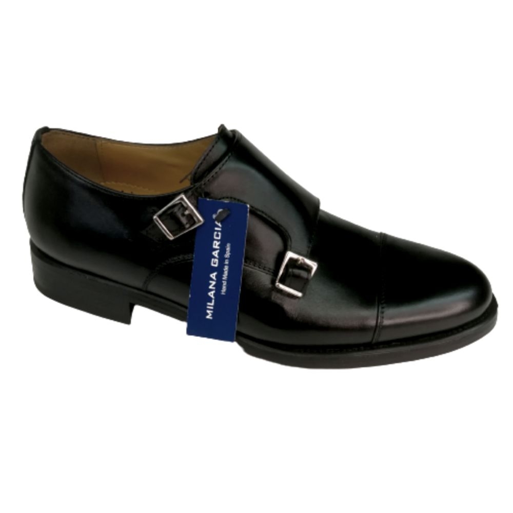 Zapato de hombre fabricado en España. Piel color negro de la mejor calidad. Forrado en piel. Pala cortada. Piso de cuero pegado y cosido.