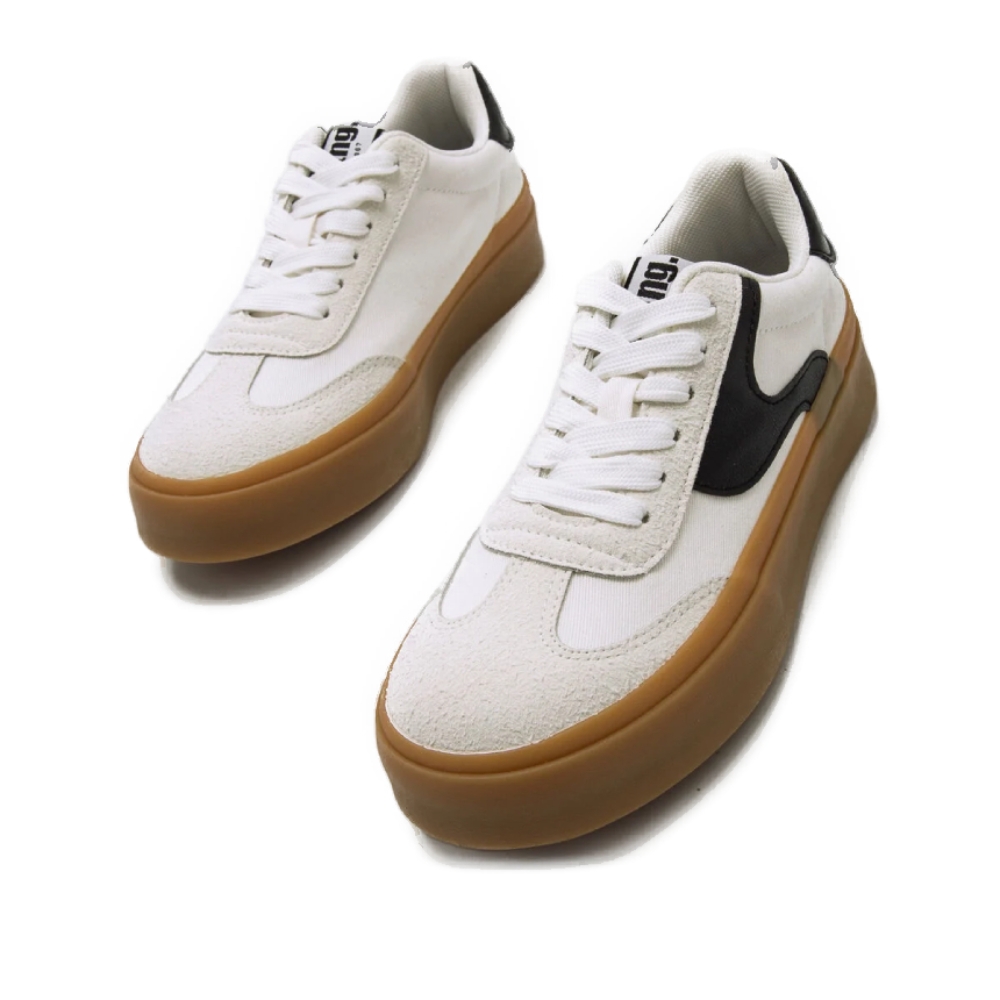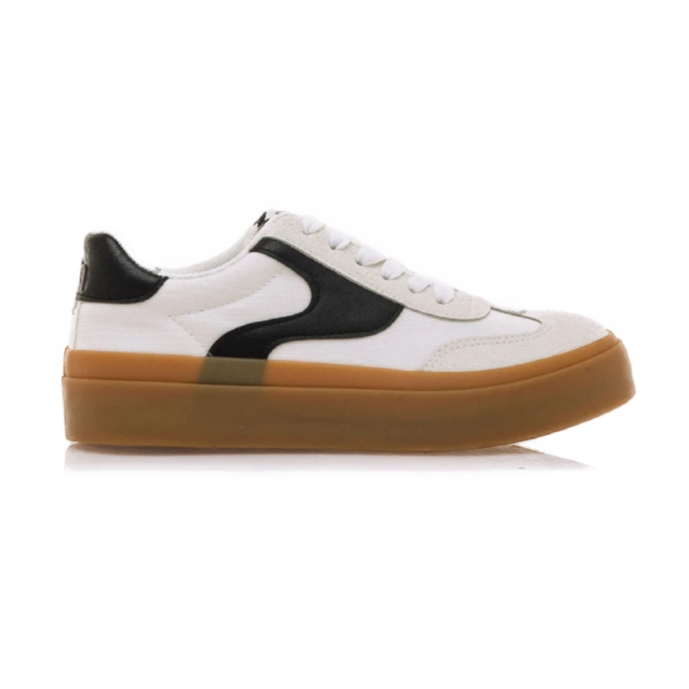 Deportiva zapatilla Skaty Mustang para mujer, inspirada en la clásica bamba blanca, destaca gracias a su original diseño con paneles de color negro. Logo de la marca en la lengüeta. Diseño de doble piso en color marrón caramelo. Únete a las últimas tendencias de la mano de Mustang.