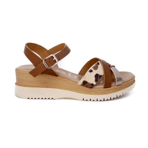 Sandalia de piel con tiras cruzadas y cierre de hebilla. Planta de gel acolchadas. Ligera cuña de 5 cms. Color cuero con detalles de animal print tan de moda esta temporada.