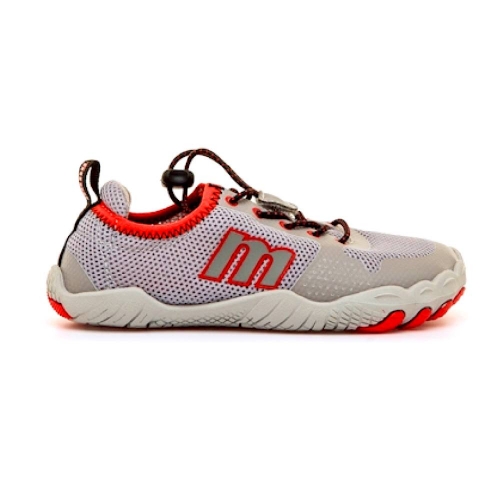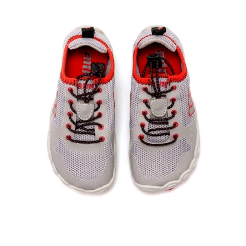Zapatillas de color gris con detalles en rojo para niño, modelo Scarpo de mtng, de estilo deportivo funcional. Su diseño cerrado con rejilla ligera mejora la ventilación. Incorpora sistema de ajuste con cordón elástico y tope, que facilita el calce rápido y seguro. La suela con relieve y el contorno de los deditos asegura comodidad. Un modelo dinámico para que los peques disfruten en los meses cálidos.