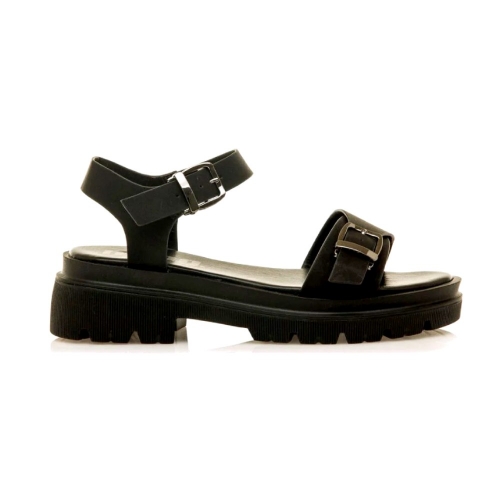 Sandalias negras planas de mujer, modelo Zuri de la marca Mtng. Este modelo de pala abierta combina diseño robusto y comodidad, con una suela gruesa tipo track que aporta altura y estilo urbano. Cuentan con dos correas ajustables con hebillas metálicas, lo que permite un ajuste seguro y personalizado. La plantilla acolchada garantiza confort durante todo el día, mientras que la suela antideslizante proporciona estabilidad en cada paso.