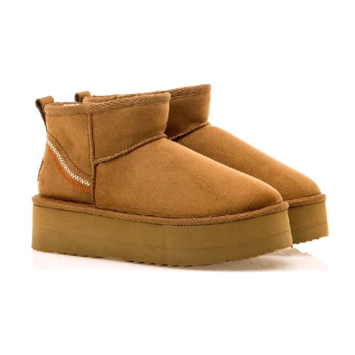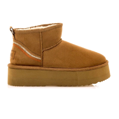 Botín Nivia Mustang de estilo australiano para mujer, diseñado en color marrón cuero, destaca gracias a su cómoda doble suela. Como detalle incluye un original bordado en el talón de color blanco y rosa. Incluye un forro interior de pelo sintético de color negro. Te llevarán con comodidad y estilo allá donde quieras llegar.
