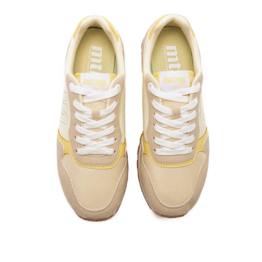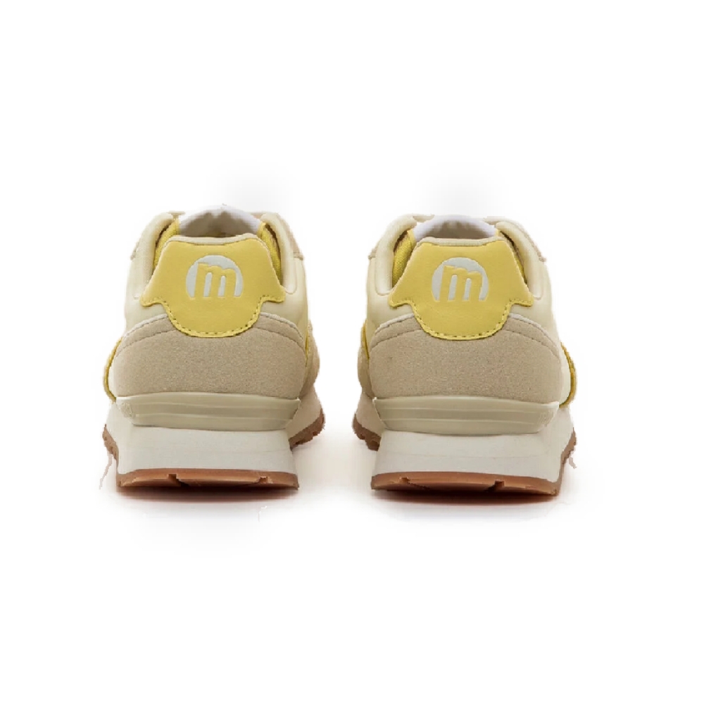 Zapatillas amarillas con detalles en beige y blanco para mujer, modelo Joggo Classicde Mustang. Este diseño combina una base clara con contrastes suaves que aportan un toque luminoso y actual, ideal para looks urbanos relajados. La silueta retro y el logo lateral en relieve le dan un aire vintage, mientras que la suela con relieve y las plantillas con tecnología Starfit, mejoran la comodidad en cada paso. Con certificado VEGANO sellado por INESCOP, el cual garantiza que la naturaleza química principal del material no se corresponde con fibras de origen animal.