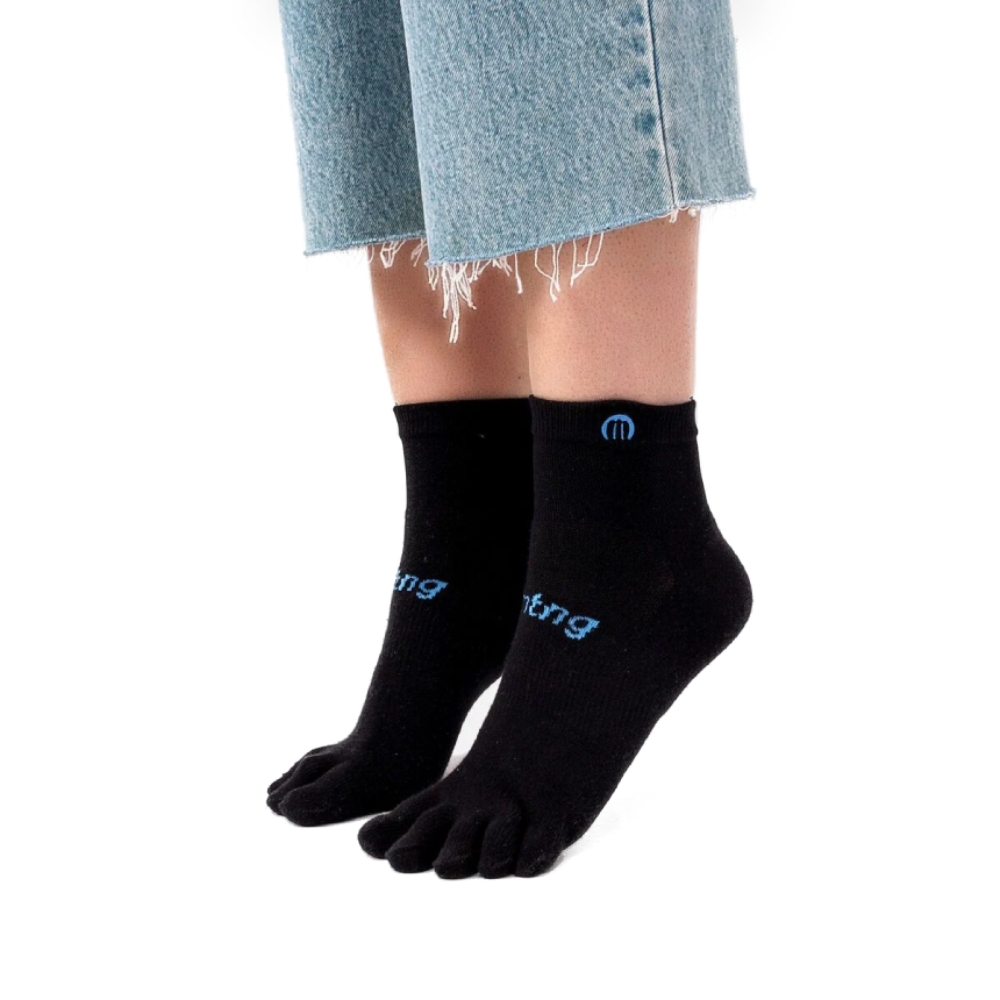 Calcetines barefoot de color negro para adultos de la marca Mustang, modelo Free Socks. Diseñados para adaptarse al movimiento natural del pie. Respeta la separación anatómica de los dedos, lo que favorece la movilidad y mejora la sensación al caminar. Cuentan con agarre ergonómico de talón para evitar deslizamientos y una banda elástica en el arco que proporciona mayor sujeción durante el uso. Destacan los logos de la marca bordados en azul, que aportan un detalle visual distintivo.