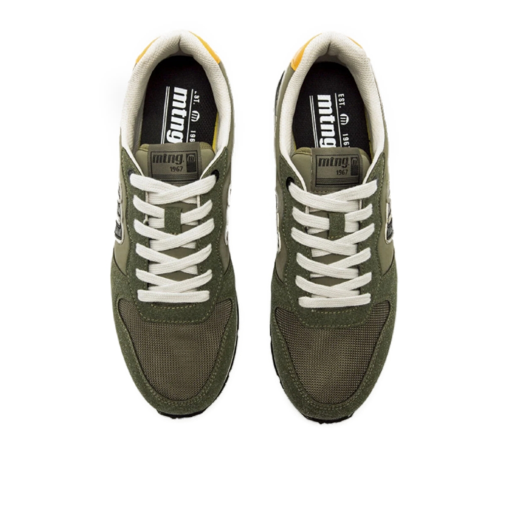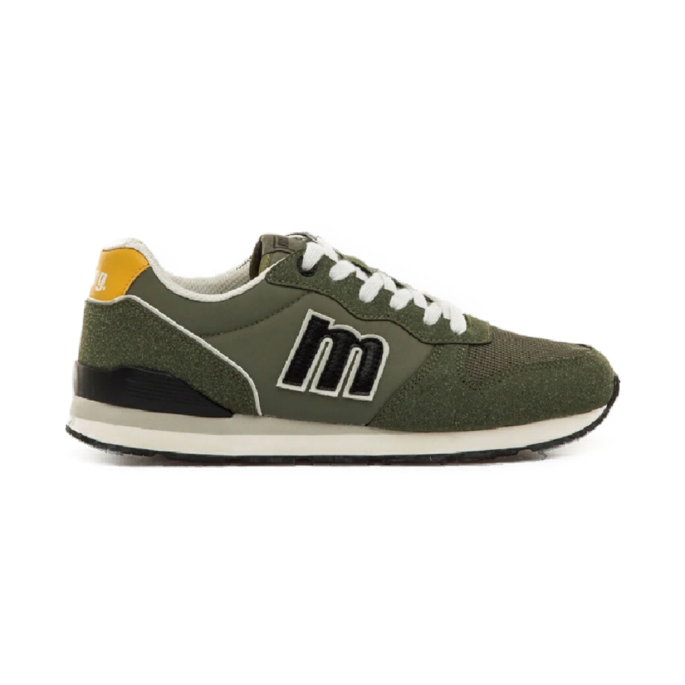 Zapatillas de color verde kaki para hombre de la marca Mustang, modelo Joggo Classic, de estilo retro deportivo. Presenta una combinación de paneles en distintas texturas con detalles en contraste como el talón amarillo y el logo lateral en negro con borde blanco. El diseño incluye cordones blancos y suela bicolor con base negra. Equipadas con plantillas con tecnología Starfit, que mejoran la comodidad en cada paso. Su estética versátil y cómoda la convierte en una opción ideal para looks relajados con un toque vintage. Con certificado VEGANO sellado por INESCOP, el cual garantiza que la naturaleza química principal del material no se corresponde con fibras de origen animal.
