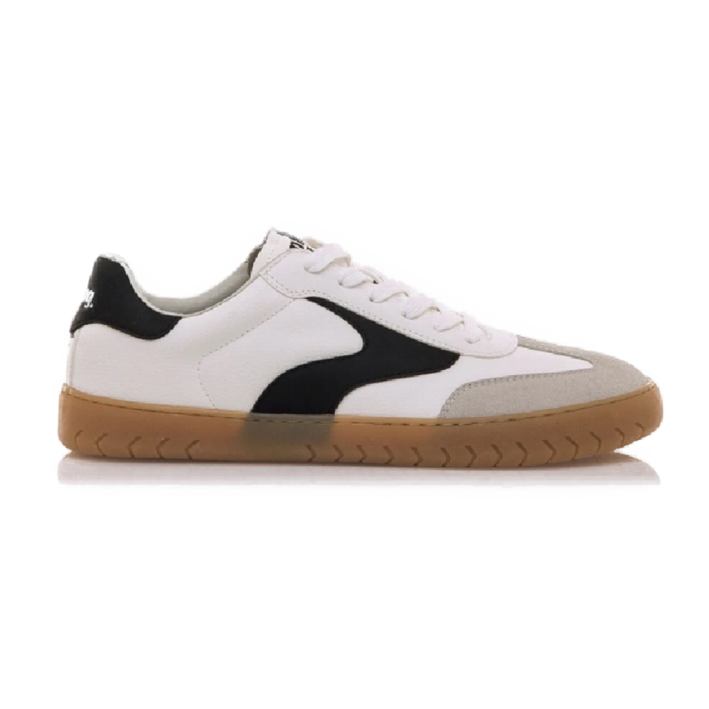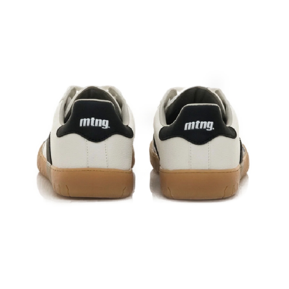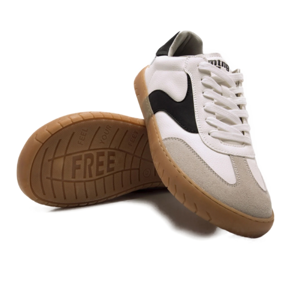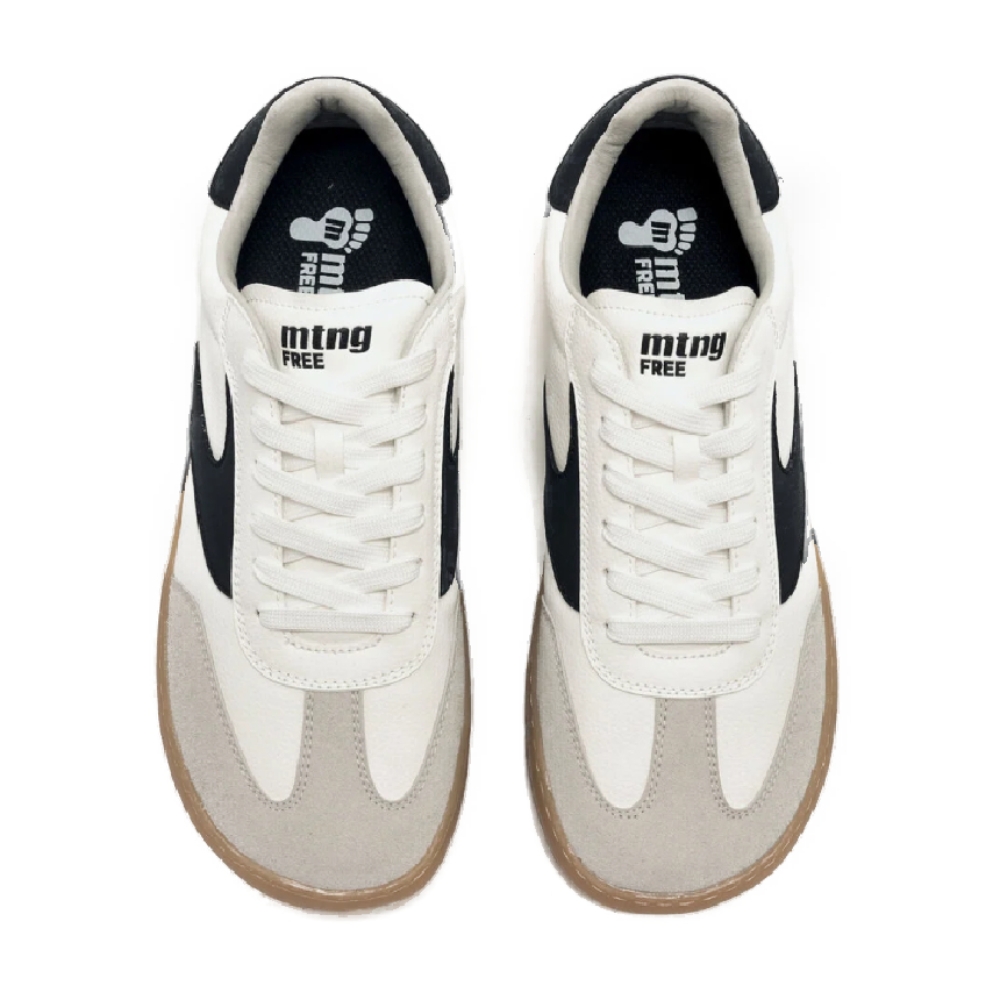 Zapatillas de color blanco para hombre, modelo Free Jym de mtng. Combina paneles blancos con detalles negros en los laterales y talón, y un refuerzo en la puntera en tono gris claro. La suela marrón de acabado texturizado aporta un toque vintage a este diseño de inspiración retro. Diseñadas y desarrolladas especialmente en colaboración con el Dr. Juanjo López, traumatólogo deportivo, para respetar el desarrollo natural del pie. Se trata de un calzado minimalista que gracias a su puntera ancha, suela totalmente plana (cero drop) y flexibilidad, mejora la anatomía del pie y favorece una mejor posición del mismo. Se vende con una plantilla de transición para hacer el cambio de calzado convencional a minimalista de manera progresiva. Con certificado VEGANO sellado por INESCOP, el cual garantiza que la naturaleza química principal del material no se corresponde con fibras de origen animal.