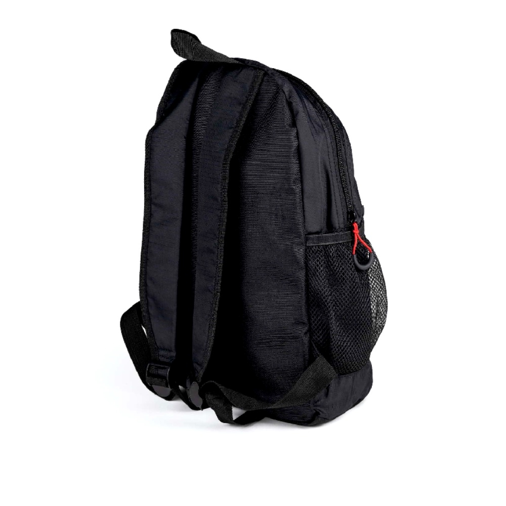 Mochila pequeña negra en formato slim. Incorpora un bolsillo frontal con cremallera en contraste y dos bolsillos laterales de rejilla. Logo Munich en la parte frontal y dos asas de hombro ajustables. MEDIDAS: 21 x 14 x 38 cm CAPACIDAD: 11 Litros PESO: 0,3kg