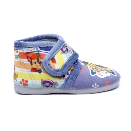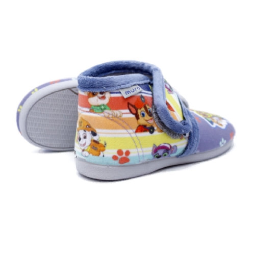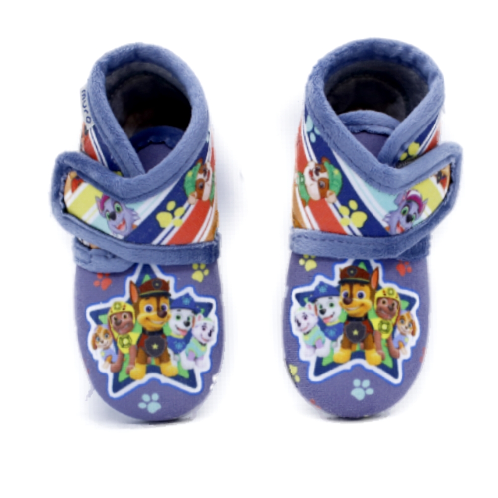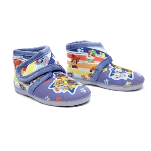 Zapatilla de casa cerrada para niños, muy cómoda para el hogar, estilo botita, con práctico cierre adherente para facilitar su calce y ajuste en el pie, en tejido textil suave, denominado calpe, . Adornos: serigrafía de la patrulla canina en toda la botita.