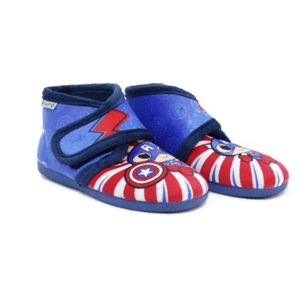Zapatilla de casa con TIRA ADHESIVA para niños. Viene fabricada en bamara suave y calentito con dibujos del Capitán América. Suela de caucho antideslizante y totalmente flexible. Apto para lavadora.