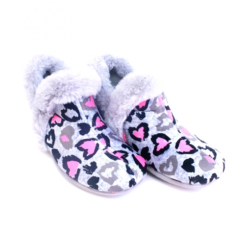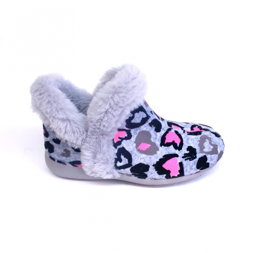 Zapatilla de casa abotinada  en color gris y fucsia para niña y mujer. Un modelo muy calentito y confortable que estarás deseando poner al llegar a casa. Fabricado en suapel y cuello de pelo. Fácil colocación gracias a sus aperturas laterales.  Suela de goma antideslizante.