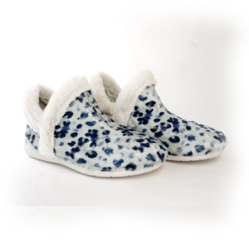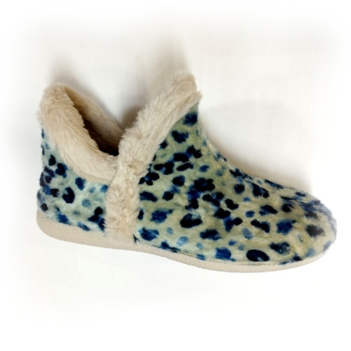 Preciosa y cómoda zapatilla de casa estilo bota. Ideal para estar calentita en casa. Realizada en tejido Bamara con bordes de borreguito. Suela de goma antideslizante