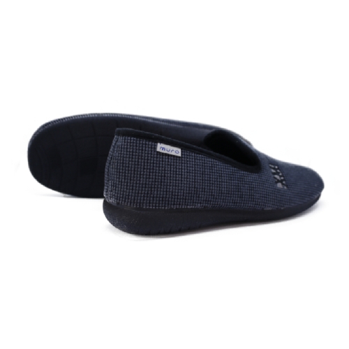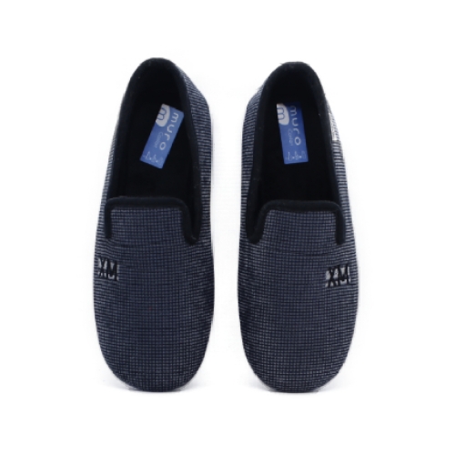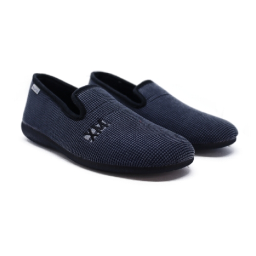Zapatilla de invierno para hombre realizada en suave material cálido con un diseño en tonos grises y negros y un detalle bordado en el lateral. Suela ligera de goma antideslizante.